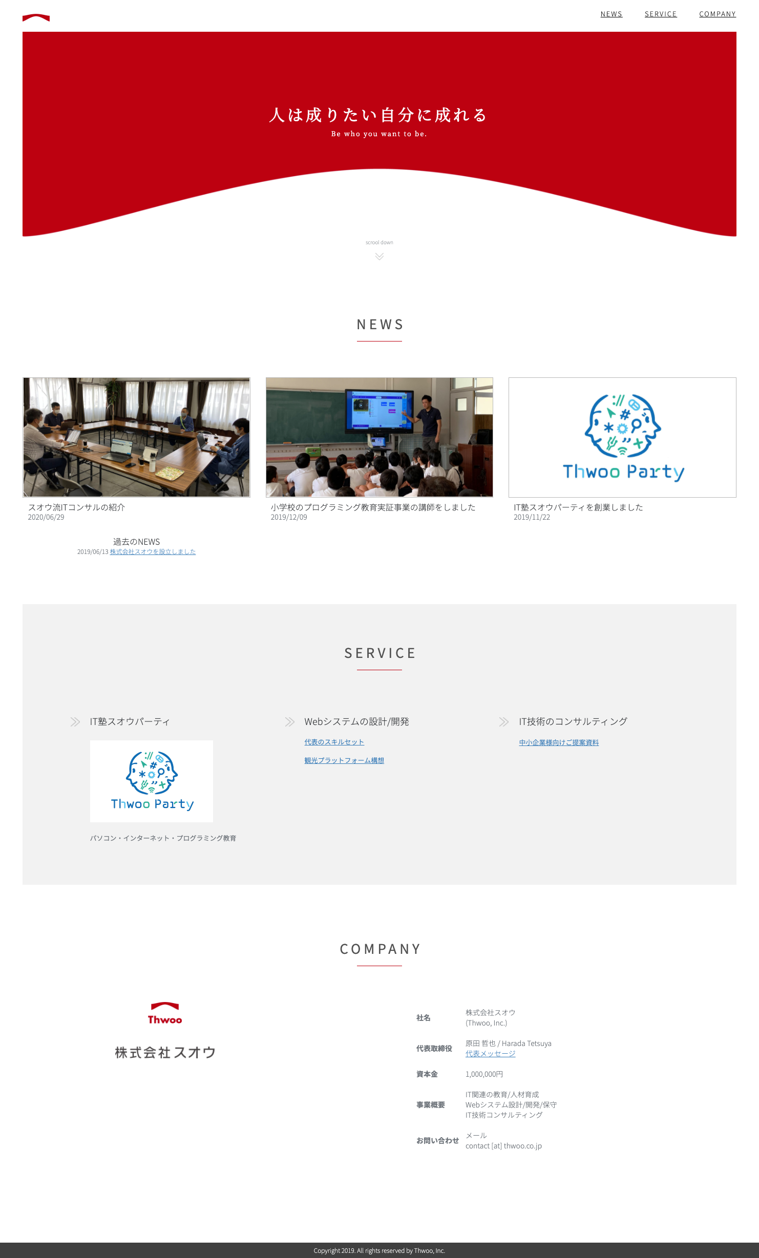 株式会社スオウ様のWebサイトを制作しました。シンプルでありながら、イメージカラーである赤をアクセントにし、モットーが目を引くように。